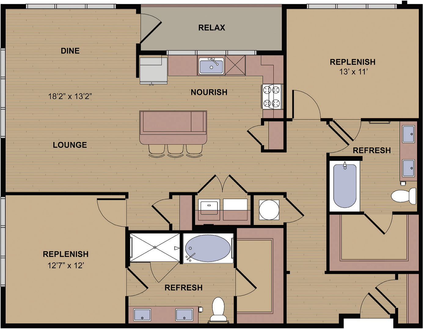 Entry opens into a foyer with a closet immediately on the right. At the end of the foyer is bedroom 1 measuring 13' x 11'. At the end of the foyer on the right is a private bathroom with dual sinks, tub/shower, and a walk-in closet. Bedroom 1 also has access to the bathroom. At the end of the foyer on the left is open access to the kitchen. The kitchen has an island with bar seating, washer and dryer, and open access to the living and dining area measuring 18'2" x 13'2" with balcony access. To the left of the kitchen is a small foyer with a closet and access to bedroom 2 measuring 12'7" x 12' with a private bathroom. The bathroom has dual sinks, tub, shower, and a walk-in closet.